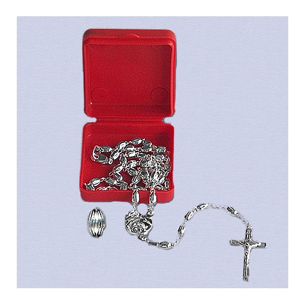 Rosario de plata de ley, con estuche. Las cuentas del rosario son en forma oval.